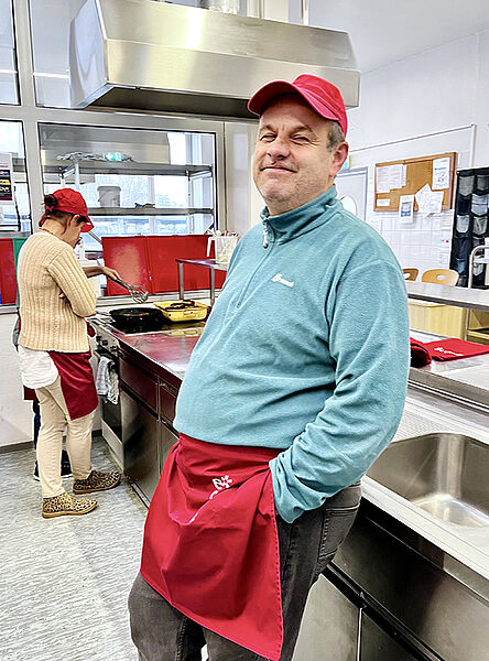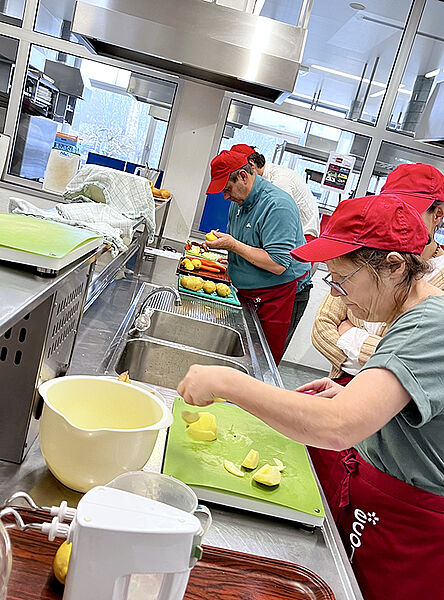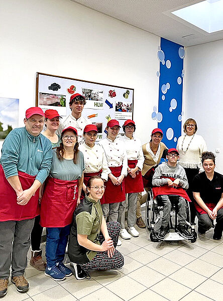 Kund/innen und Begleiterinnen der Lebenshilfe Fürstenfeld haben uns besucht. Die Schüler/innen der 4 AGM kochten gemeinsam mit ihnen ein typisch österreichisches Menü: Frittatensuppe, Faschierte Laibchen mit Kartoffelpüree und Strudelvariation mit Vanillesauce.